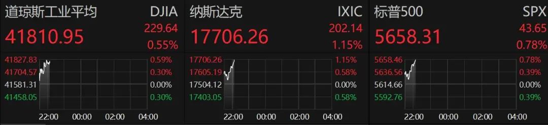 美股三大指数集体高开,道指涨0.13%,纳指涨0.49%,标普500指数涨0.31%。截至发稿,道指涨0.55%,纳指涨逾1%,标普500指数涨0.78%。